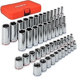 【SUPERIOR QUALITY AND DURABILITY】 Crafted from premium Chrome Vanadium steel (CR-V), this 47-piece 1/4" drive socket set is built to withstand rigorous daily use. The sockets undergo an advanced heat-treatment process that achieves exceptional hardness, delivering superior wear resistance and reliable performance under significant torque. This professional-grade construction ensures your investment in quality will provide years of dependable service. 【PRECISION 6-POINT DESIGN】 Every socket in this comprehensive set features the efficient 6-point design that maximizes contact with fastener heads. Combined with permanently stamped size markings for quick identification, this engineering minimizes slipping and prevents rounding of bolts and nuts. The precision design saves valuable time and reduces frustration during automotive repairs and maintenance projects. 【CORROSION PROTECTION】 Each socket boasts a high-gloss polished finish that creates a robust barrier against rust and corrosion. This durable coating not only ensures long-lasting performance but also allows for effortless cleaning. The smooth surface provides a comfortable grip while maintaining a professional appearance that enhances your working experience. 【COMPLETE 47-PIECE SET】 This professional 1/4" drive impact socket set includes 24 standard sockets(3/16”, 7/32”, 1/4”, 9/32”, 5/16”, 11/32”, 3/8”, 7/16”, 5/32”, 1/2”, 9/16”, 4mm, 5mm, 5.5mm, 6mm, 7mm, 8mm, 9mm,10mm, 11mm, 12mm, 13mm, 14mm, 15mm) and 23 deep sockets(3/16, 1/4”, 9/32”, 5/16”, 3/8”, 1/2”, 9/16”, 7/32”, 11/32”, 7/16”, 4mm, 5mm, 5.5mm, 6mm, 7mm, 8mm, 9mm,10mm, 11mm, 12mm, 13mm, 14mm, 15mm) covering comprehensive SAE and Metric sizes. 【SECURE STORAGE CASE】 The heavy-duty blow molded case features custom-fit slots for each socket and clear size labels, ensuring perfectly organized storage. Its robust construction protects your tools from impacts during transport, while the integrated handle makes transportation to any job site effortless and hassle-free.