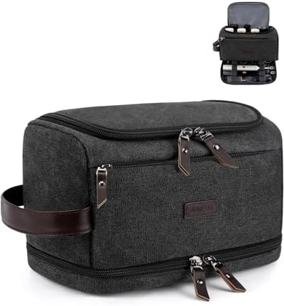 ZOMFELT Toiletry Bag for Men, Dual Layers Canvas Travel Toiletries Bag, Water-Resistant Travel Organizer with Elastic, Large Capacity Dopp Kit, Hanging Shaving Hygiene Bag, Black