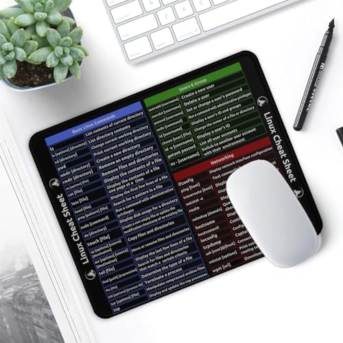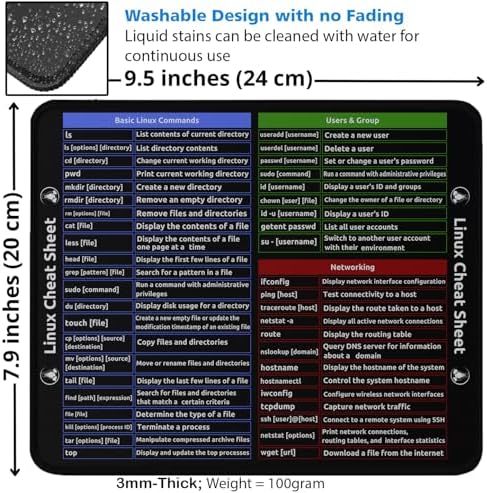 Master Linux commands at your fingertips with this practical mousepad featuring an extensive quick reference guide. The 9.5 x 7.9 inch surface displays essential Linux commands organized into Basic Commands, Users & Group, and Networking sections - perfect for both learning and quick lookups during your work. Built for durability with a 3mm thickness and weighing 100 grams, this mousepad combines functionality with reliability. The dense anti-slip rubber base keeps it firmly in place during intense computing sessions, while the durable edges prevent fraying and wear. The washable surface design maintains its crisp command reference even with regular cleaning - simply use water to remove liquid stains and continue your work. Whether you're a system administrator, developer, or Linux enthusiast, this mousepad serves as both a practical desk accessory and a valuable learning tool for everyday command line operations.