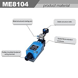 Rated current: AC 250V 5A Product Features: The ME-8104 features a side-rotating roller actuator that supports multi-angle installation. It has a sturdy structure and is resistant to damage. good-quality copper contacts are used, ensuring excellent electrical conductivity and stable operation. Product structure: The metal base structure is sturdy,rust proof and corrosion-resistant, while the rubber dustproof connection port can be insulated and dust-proof. Protection level IP65. Roller Bearing Swivel Arm: A roller bearing-supported swivel arm structure enabling free rotation (typically supporting multi-directional adjustment from 0°to180°) with angle-locking capability at any position.The roller design significantly reduces friction resistance,minimizes mechanical wear, and extends service life,while ensuring smooth,jam-free triggering actions for reliable operation. Widely applicable: Suitable for industrial manufacturing industry, textile industry, chemical industry, machine tool equipment and other fields