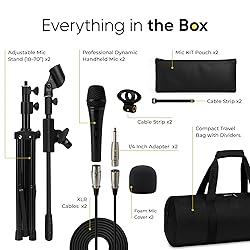 - Elevate your performance with a complete 2-pack XLR microphone system designed for singers, presenters, and event professionals. Each wired microphone delivers clean, reliable sound with a 15-foot XLR cable for true stage reach. Whether you need a vocal microphone for live music, a karaoke microphone for parties, or a singing mic for rehearsals, this bundle gives you the clarity and durability you can depend on. Both mics come with foam covers to reduce noise and improve projection. A secure microphone holder and mic clip keep each singing microphone firmly in place, while adjustable mic stands provide hands-free freedom. Each microphone stand extends from 18 to 70 inches, making it versatile for standing performers, seated speakers, or studio setups. Built with rugged dynamic microphones, the system isolates your voice and minimizes background interference. Every mike stand is reinforced with a tripod base for balance, while the mic stand floor and microphone stand floor options add stability in professional environments. The integrated boom arm mic stand and boom mic stand let you angle your microphone exactly where you need it — perfect for instruments, podcast setups, or presentations. To keep your equipment protected, everything packs neatly into the included combo carry case. Compact yet durable, it organizes cables, clips, and accessories, so you’re always ready to travel. From weddings to studio sessions, this is more than just a stand microphone — it’s a complete dynamic microphone system for serious performers.