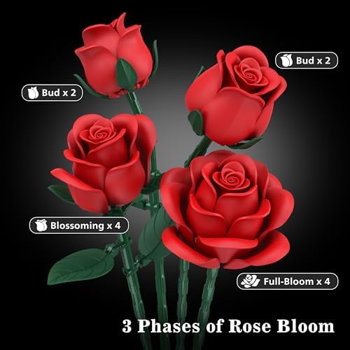 - 【Classic Red Roses - Always in Style】: Red rose bouquet is a timeless classic bouquet. No matter on valentine's day, birthday gifts for women, gifts for mom, or christmas gifts for women, anniversary gifts for women, it must the great choice. Our red flowers building sets botanical collection include 12 pcs rose flowers, 3 different stages - 4 Fully Bloomed Roses, 4 Blooming Roses and 4 Budding Rose, with roses of different growth forms evoking a sense of mystery in life(Not Included Vase)