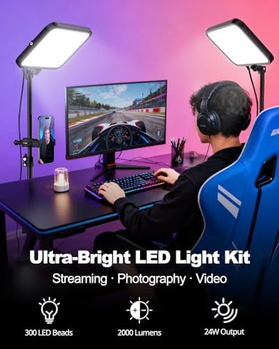 UBeesize 2-Pack LED Video Light Kit, 3000-6500K Dimmable Photography Studio Lights with Tripod Stand & Phone Holder, Video Recording & Streaming Lighting for Makeup, Gaming, YouTube