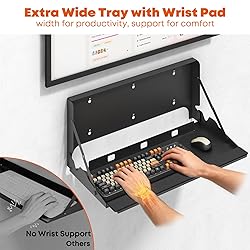 Flip-Down and Space-Saving Design: This flip-down keyboard wall mount easily folds up when not in use, keeping your workspace clutter-free. Its versatile tray securely holds both standard keyboard or a laptop up to 16 inches. It is ideal for daily use in home offices and studios Extra-Wide 12-Inch Tray with Wrist Rest: The extra-wide 12-inch vented tray is designed to fit standard keyboards and mice, while the wrist support design ensures comfortable and ergonomic typing Heavy-Duty Steel, Holds 22 lbs: Constructed from steel, this wall mounted keyboard tray supports keyboards and mice without bending or wobbling, with a load capacity of up to 22 lbs Fits Multiple Wall Types: It can be securely mounted on drywall, with wood studs, brick, or concrete walls. The manual provides detailed installation instructions for different wall types Mouse Pad and Wrist Pad Included: This typing platform comes with a mouse pad, a wrist pad, a magnetic closure, and Velcro pads. These ensure a stable, ergonomic, and ready-to-use experience after installation