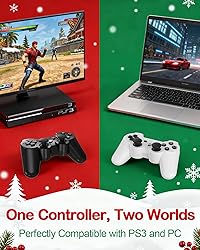 🎮【𝐑elive the 𝐂lassics with 𝐖ireless 𝐅reedom】Step back into the golden era of gaming with this upgraded Wireless Controller 2 Pack for PS3.Whether you're revisiting nostalgic PS3 titles or playing on your PC,enjoy smooth plug-and-play connection and stable Bluetooth performance with no lag or driver setup needed.Designed for optimal performance with PlayStation 3 system. ⚡【𝐃ual𝐒hock 𝐕ibration and 𝟔-𝐀xis 𝐌otion for 𝐑eal 𝐅eel】Replacement for playstation 3 controller experience every crash,explosion,and race like you're truly in the game.The upgraded for ps3 controller built-in double vibration motors and 6-axis motion sensing respond instantly to your actions, giving you immersive, realistic feedback with each move and hit. 🔋【 𝐋ong 𝐁attery 𝐋ife for 𝐄ndless 𝐏laytime】Powered by a 500 mAh rechargeable battery,each upgraded for ps3 wireless controller delivers up to 8 hours of gameplay. The auto-sleep mode helps save energy so you can focus on gaming, not charging. Play wirelessly or keep the fun going with the included USB cable. 🕹️【𝐁uilt for 𝐏recision and 𝐃urability】The Perfect for ps3 controllers enhanced analog sticks and sensitive action buttons ensure precise control and zero-dead-zone movement. Each controller has passed 12 million stroke tests, guaranteeing ultra-responsive performance and long-lasting durability. 🎁【𝐓he 𝐏erfect 𝐆ift for 𝐄very 𝐆amer】Pack includes 2 wireless controllers,2 charging cables, and a user manual,backed by lifetime customer support.Compatible for ps3 remote control Ideal for family game nights, birthday surprises,or reliving childhood memories,because real gamers never outgrow PS3.Ideal for gaming sessions with PlayStation 3.