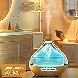 Large Capacity Aroma Diffuser: 500 ML essential oil diffusers for home is wonderful for large rooms. This diffuser is also includes 7 ambient light chose to create a relaxing feeling to your room and make your life more colorful 2 Mist Modes: The scent diffuser can provide stable cool mist to increases your room humidity without make your furniture and your floor to get humid. You can aslo adjust the mist mode to get low Mist: 30ml/h and high Mist: 60ml/h by pressing the power button to fit your room size Remote Control: The aromatherapy diffuser is provide an easy to use remote control that can control it from up to 15-feet and adjust the lighting and misting modes as well as set the humidifier's timer, the diffuser has 1/3/6 hour timers and steady ON mode, as well as a auto-switch that prevents it from overheating in case it runs out of water 14 Colors LED Light: The essential oils diffuser can provide 7 colours with 2 modes, the LED light can be fixed or cycled through. The mist and light functions of this diffuser can be work separately. you can turn off the light at night while sleeping, or use this diffuser as a nightlight Low Noise for Better Sleep: The aroma diffuser is using upgraded quiet fan with noise reduction technology. The noise level is lower than 25 dB, it's created a peaceful and soothing environment for learning, working and sleeping