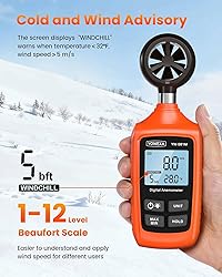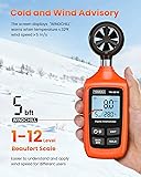 【Essential Multi-Function Outdoor Tool】The air flow meter measures wind speed and temperature to help comprehensively assess environmental safety. It also features auto shut-off/low-battery alert/backlit LCD screen, MAX/MIN/Real-time measurement modes/data hold...Indispensable companion for outdoors. Accuracy: wind speed: ±5%+0.5; temperature: ±1℃ 【5 Wind Speed Units for Versatile Usage】This portable anemometer precisely measures wind speed in five units: m/s, mph, km/h, ft/min, and knots. Supports °F/°C conversion to adapt to diverse scenarios, making it a professional wind speed anemometer 【Windchill Alert and Beaufort Scale Visualize Wind Speed Value】Displays “WINDCHILL” when temperature drops below 32℉ and wind exceeds 5m/s, accurately assessing perceived temperature to mitigate cold-related health risks. The Hvac tools provide Beaufort scale readings from 0-12, standardizing wind force for versatile applications 【Versatile Applications, Outdoors Choice】Ideal for surfing, drone flying, kite-flying, boating, golfing, and other outdoor pursuits, this wind checker helps assess local weather conditions and evaluate wind's impact on activities. Its high-sensitivity design accurately measures faint airflows in HVAC systems and duct vents. NOTE: Perfect companion for manual CFM calculations. Air Flow in CFM (Q) = Wind Speed (V) × Duct Cross-Sectional Area (A) 【Ergonomic and User-friendly Design】Our handheld wind detector fits comfortably in one hand for easy operation. Silicone-textured buttons ensure comfortable, stable operation while its slip-resistant design guarantees durability 【Optimized Details for Enhanced User Experience】Battery compartment opens easily by hand—no screwdriver needed; Auto-shutdown can be disabled for uninterrupted long-term data logging; Keypress sounds can be muted, ideal for quiet environments like hunting or libraries; Backlight stays on continuously, ensuring uninterrupted readings