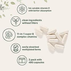 Micro Ingredients offers Pure Methylated B Complex Vitamins, an 11-in-1 formula that includes fat-soluble vitamin C. A thoughtfully designed capsule blend featuring raw, active ingredients made without fillers. Total of 480 capsules, providing a comprehensive mix of vitamin C (ascorbyl palmitate + ascorbic acid), thiamin, riboflavin (R5P), niacin (niacinamide), vitamin B6 (P5P), folate (methylfolate), vitamin B12 (methylcobalamin), biotin, pantothenic acid, choline, and inositol per serving. A complete B-complex combined with vitamin C, choline, and inositol for a well-rounded vitamin profile suitable for daily use. Formulated with active methylated vitamins and a fat-soluble form of vitamin C for optimal stability, purity, and strength. Premium non-GMO B complex supplements. Made without fillers, soy, dairy, gluten, fish, shellfish, peanuts, and tree nuts. Ingredients must pass a 3rd party lab test to ensure our product is safe, pure, and potent.