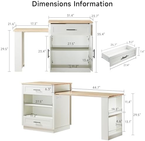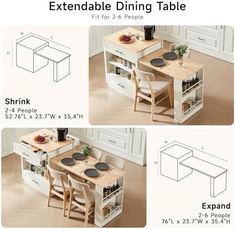 - 【2-6 Person Expandable Dining Table】Kitchen islands expandable kitchen island-style design optimizes the space to the greatest extent. The size of the island cabinet is 52.76". It can be unfolded to 76" by simply pulling it out, accommodating up to 2 to 6 people and meeting the needs of multi-person dining. When not in use, it can be folded up to save space, especially suitable for small-sized kitchens.