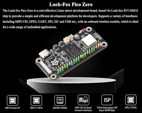 Introduction Single-core ARM Cortex-A7 32-bit core with integrated NEON and FPU. Built-in Rockchip self-developed 4th generation NPU, features high computing precision and supports int4, int8, and int16 hybrid quantization. The int8 computing power of RV1106G3 is 1TOPS. Built-in self-developed third-generation ISP3.2, supports 8-Megapixel, with multiple image enhancement and correction algorithms such as HDR, WDR, multi-level noise reduction, etc. Built-in 16-bit 256MB DRAM DDR3L, which is capable of sustaining demanding memory bandwidths. Features powerful encoding performance, supports intelligent encoding mode and adaptive stream saving according to the scene, saves more than 50% bit rate of the conventional CBR mode so that the images from the camera are high-definition with a smaller size. Wi-Fi 6 and Bluetooth module: Onboard 2.4GHz WiFi 6 and Bluetooth 5.2 (LE) Bluetooth Module. Providing Stable Connection And Efficient Transmission. Antenna Switching: Flexible Switching Between External Antenna and Onboard Antenna to meet more usage scenarios. MIPI CSI 4-lane Interface: Composed of dual MIPI-CSI (2-lane) interfaces. Multiple Audio Interfaces: Onboard microphone + speaker header. meets a variety of audio application scenarios. Comes with Online Tutorial Usage Guide and Online Development Resource, Please check: n9.cl/v5omfy Package Content Luck-fox Pico Zero x1