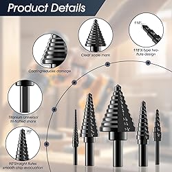 【Package Contents】The FACIACC step drill bit set includes five stepped drill bits in 50 sizes, a center punch, and an aluminum storage case. It's versatile enough to meet your drilling needs for different diameters. 【HSS Titanium Coating】These step drills are made of high-speed steel and titanium coating to ensure maximum durability and sharpness, reduce friction, and have excellent corrosion and rust resistance. 【Product Feature】This set of step drills features a 118° split tip and double groove design. The 118° split tip reduces friction and drag, speeding up cutting while preventing tilting and deviation from the center. The double groove design allows for smoother cutting and quick chip removal. 【Complete Accessories】The center punch creates a powerful impact when pressed against the surface, and the internal steel spring punch ensures accuracy and precision. All drill bits can be stored neatly in the aluminum storage box for easy organization. 【Widely Use】The FACIACC step drill bit set can be used on wood, thin steel plate, aluminum, sectional strip, plastic and so on.The step bits are great for DIY home projects and construction projects, etc.