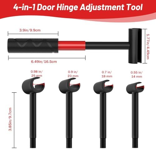 - Multiple sizes: The hinge wrench kit comes with 4 replaceable heads in different sizes (0.55in/14mm, 0.7in/18mm, 0.9in/23mm and 0.98in/25mm), and the door hinge adjuster handle is 6.49in/16cm long