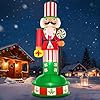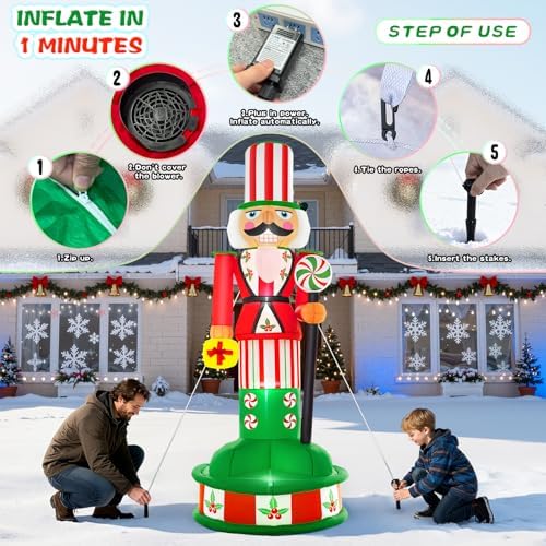 - 【Design of Inflatable Nutcracker】To Christmas,nothing spells holiday like inflatable nutcracker,stand tall with this eye-catching soldier!vibrant classic jacket features festive.his iconic striped hat&pants pop with peppermint details,complemented by a bright yellow gift box.warm LED glow illuminates his cheerful beard and pink cheeks.lights add playful charm.the base ensures stability on lawns or patios.creates instant christmas magic and conversation at home - a must-have holiday centerpiece!