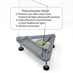 Alignment Stand with Polycarbonate protective shield only -- Mevo Gen2 is NOT included Removable Polycarbonate protective shield protects the front of the Mevo Gen2 from inadvertent high velocity ricocheting golf balls. Polycarbonate (sometimes referred to as Lexan) is the material used to layer bulletproof glass. Integrated large bullseye bubble level with 4-way angle markings provides visual leveling aid. Zinc-plated Steel adjustment screws and nuts Precision-engineered recessed fitment for the Mevo Gen2's base and kickstand help with quick, consistent setup of your Mevo Gen2. Designed to provide the Mevo Gen2 extra support to reduce tension on the Mevo Gen2's plastic kickstand. Height adjustable up to 2.5" to help with uneven ground and / or for elevating your Mevo Gen2 to match the height of your hitting surface / hitting mat 3D-printed with PETG plastic to prevent warping when used outdoors on hot summer days Designed and Made in USA