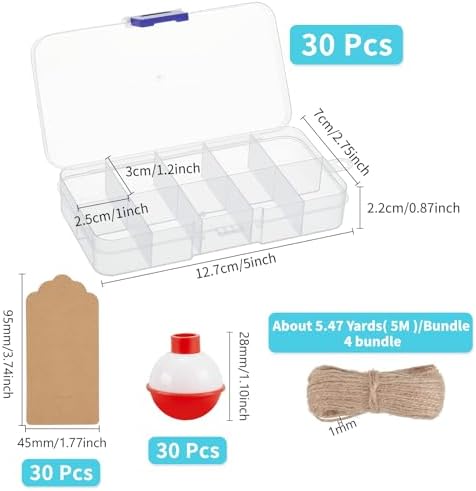 - 【Fishing Party Pack】This package includes 30 mini tackle boxes, 30 red and white fishing bobber, 30 kraft paper tags, and 20 meters of jute twine. You can use these materials to make candy boxes for the friends at your fishing party, making it the perfect choice for hosting a fishing-themed party