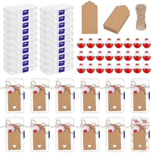 30 Set Fishing Candy Little Tackle Boxes with 30 Fishing Bobber 20M Jute Twine 30 Kraft Paper Tags for DIY Decoration Fishing Party Favors Gone Fishing Theme Supplies