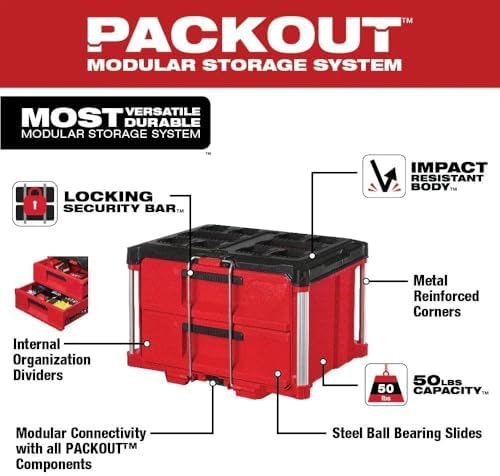 2-Drawer Tool Box has a 50lbs weight capacity and a locking security bar that allows you to padlock the drawers closed keeping them securely shut during transport. As part of the Modular Storage, the toolbox allows you to customize your storage system for easy transportation and organization of tools and accessories. This portable toolbox with drawers is constructed with impact-resistant polymers, all-metal ball-bearing slides, and metal-reinforced corners for ultimate jobsite durability