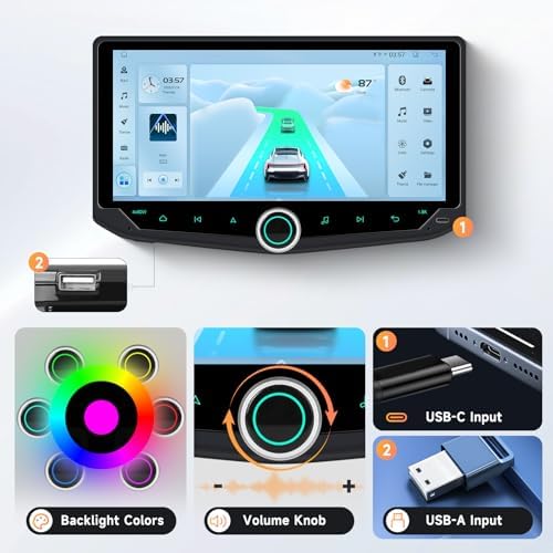 - ►[Large 10.88” 1600x720P IPS Touchscreen]: Enjoy a stunning visual experience with the 10.88-inch 1600*720P HD IPS touchscreen. The large display offers vibrant colors and wide viewing angles, ensuring clear visibility even under sunlight. Features a big volume knob for convenient control, color-changing backlight for a stylish look, and both USB-C & USB-A ports for flexible connection. Features two foldable magnetic brackets on the back, allowing you to conveniently place your smartphone while driving.