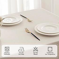 Thick Fabric: This tablecloth is made of upgraded faux linen, which is thicker, denser and more tear-resistant than traditional weave. It stays smooth, soft, and shrink-proof after washing. The solid color fabric imitating linen, combined with the full-frame geometric cutout pattern design, creates a relaxed and elegant dining atmosphere. Stain & Wrinkle Resistant: Made with a double-yarn parallel weaving process, it features water resistance, stain resistance and anti-wrinkle properties. It can easily protect the table from scratches and stains, keeping the space tidy. Versatile for All Occasions: Boasting a beautiful hollow border design, it’s perfect for Christmas, holidays, daily meals, parties, picnics, spring gatherings, restaurants, and cafes—adding festive vibes to make any event special and memorable. SIZING: 52x70" rectangular: Fits 28x46"-42x54" tables, seats 4-6.Measure your table using the size guide before purchase for a perfect fit. Easy to Maintain: Wipes clean with a damp cloth (recommended),cold washable, no bleach, iron on low heat. Wrinkle free after ironing.