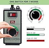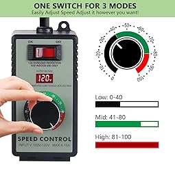 - Features: UL listed Speed control dial to control variable speed: Low, Medium or High speed. Come with 31-1/2" Grounded Power Cord with US standard plug. Perfect to control speed for high velocity inline fan and mini blower. Especially convenient for you when the power cord of your fan is not very long. Make your fan quieter when adjusting to low or medium speed. Safe and environmental friendly. Small and easy to use Specifications: Voltage: AC120V, 60Hz 15A Power Range:500W-1500W Fuse: 15A Dimension: 5-1/2"L x 2-2/5"W x 2-2/5" H Power Cord: 31-1/2" Note: This speed controller is only suitable for use with AC brushed motors. Please do not use it with brushless motors.