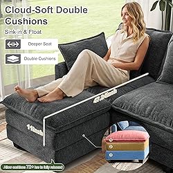 - Meet the Chenille Cloud Sectional Sofa—the modular cloud sofa designed for real life.The moment you see its billowy silhouette you’ll know why it’s called a cloud couch sectional: Soft backrest and armrest pillows, 11" double seat cushions and an ultra-soft chenille wrap invite everyone to sink in and stretch out. Built on a heightened, reinforced frame rated at 400 lbs per seat, this small sectional couch is strong enough for kids, pets and guests yet sized to fit most living rooms or open lofts.Shipped in three conveniently sized packages, the modular couch can be configured as a left chaise, right chaise, U-shaped conversation pit or even separated into individual seats. Two free ottomans lock in anywhere along the frame, instantly adding chaise lounge space or serving as extra seating when friends drop by.Need something even more compact? Look for our 58” love seat cloud sofa, shipped in 2 packages, same sink-in chenille, same 11" double cushions, same two moveable ottomans—perfect for apartments, offices or as a matching extension to the 107” set. Both sizes zip together tool-free in under 30 minutes and arrive in boxes that fit through any doorway.We chose pet-friendly, pill-resistant chenille because a comfy couch for living room life should look as good on day 1,000 as it did on day 1. Removable, machine-washable cushion covers make maintenance effortless.Whether you’re upgrading your first apartment or refreshing your forever home, this cloud sectional couch delivers studio-sofa comfort with sectional-sofa versatility. Order today and discover why the chenille cloud sofa is the last couch you’ll ever want to leave.