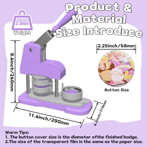 - New Design: This machine adopts high-strength engineering plastics, with its handle reinforced by stainless steel for enhanced pressure resistance. Its body and button mold are integrated, featuring light weight, a long lifespan, and easy operation. Additionally, the handle is scientifically calibrated to help you find the optimal pressure, significantly improving the stability and success rate of badge making.