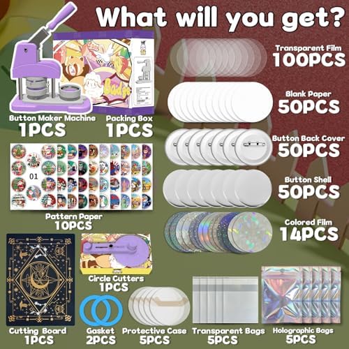 - DIY Button Maker Machine Kit Includes: 58mm (2.25 inch) Badge Maker, Circle Cutters, 50pcs Button Parts, 50pcs Blank Paper, 100pcs Transparent Film, 14pcs Colored Film, 10pcs Pattern Paper, 1pcs Cutting Board, 2pcs Gasket, 5pcs Protective Case, 5pcs Transparent Bags, 5pcs Holographic Bags. With its beautiful packaging, this button machine can be given as a gift for kids and DIY enthusiasts.