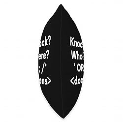 Funny Hacker design for SQL Programmer, DBA, and Hacker. Funny Hacker Injection Knock knock joke for Network programmer, computer security professional, web developer, backend coder, and database programmer. 100% spun-polyester fabric Double-sided print Filled with 100% polyester and sewn closed Individually cut and sewn by hand Spot clean/dry clean only