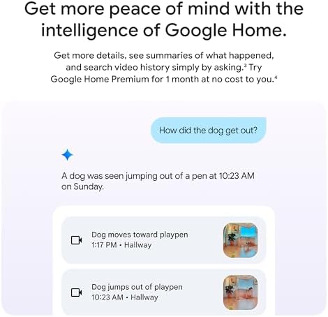 - Keep up with what’s important to you: With the intelligence of Google Home, get more detailed event descriptions and search your video history just by asking (subscription required)[3]; try Google Home Premium for 1 month at no cost to you[4]