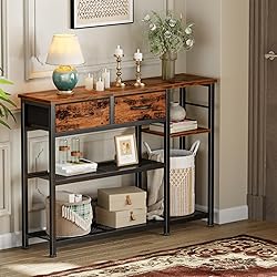 Furnulem Entryway Table 44'' Sofa Console Table with 2 Fabric Drawers, Industrial Entry Way Shoe Rack with Metal Mesh Shelf for Front Door, Hallway, Foyer Wooden Top, Sturdy Metal Frame, Rustic Brown