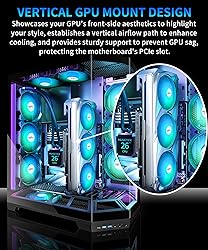 【Vertical GPU Mount Design】MUSETEX's GR3 gaming pc case features a vertical direct-insert GPU installation design, perfectly showcasing the front aesthetics of the GPU and highlighting personalized style. It establishes a vertical airflow path to enhance cooling efficiency while providing sturdy support to prevent GPU sag and protect the motherboard's PCIe slot.Traditional vertical GPU installations require a riser cable, which can impact GPU performance. Through innovative architectural design, our solution allows the GPU to be directly inserted into the motherboard's native slot, eliminating the need for a riser cable and reducing performance loss by 5%-30%. 【Removable ATX Extension Bracket】This pc case comes pre-installed with a removable ATX expansion bracket. If an ATX motherboard is not required, its bracket can be removed to free up internal chassis space and achieve a cleaner interior. We recommend pairing with a Micro motherboard for a more spacious visual effect. 【270°Full View Tempered Glass Design】The interior of this MUSETEX atx case is spacious, featuring a 270° panoramic three-sided tempered glass panel. It offers a wider view than most similar cases on the market, perfectly showcasing users' high-end cool hardware, stunning ARGB lighting effects, and beloved collectible figures, effortlessly earning the admiration of friends! 【Tower Case Powerful Space Layout】Compatible with most mainstream hardware in the market,support GPU up to 410mm(16.14"),support CPU cooling height up to 178mm,support top mounting up to 240mm liquid RAD and rear mounting up to 360 liquid RAD,support PSU up to 160mm(6.3"). 【Input/Output Ports】1 x Type-C, 2 x USB 3.0, Microphone & Audio, Power Button, Restart Button 【Excellent Cooling Meets Stunning Visuals】The MUSETEX mid-tower case comes pre-installed with 5 adjustable-speed ARGB fans for lighting enthusiasts. Through the motherboard software, you can customize various light modes and control the fan speeds, creating a dazzling light show while ensuring optimal thermal performance! 【No Risk of Purchase】if you have any problems with your mid tower atx case, please feel free to contact us by clicking on "S0ld-by-MUSETEX" and we will do our best to help you!MUSETEX strives to provide the best support for our customers!