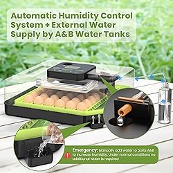 【Smart Humidity Control with Automatic Regulation】This smart professional egg incubator for hatching eggs features precision automatic humidity control with adjustable settings. The smart system maintains optimal moisture levels for incubating chicken eggs, duck eggs, and quail eggs. Built-in humidity alarm ensures perfect conditions for higher hatch rates. This intelligent system significantly reduces manual intervention for consistent hatching success. 【External Water Refill & Air Circulation System】The unique external water refill design allows easy water addition without opening the lid, preventing temperature and humidity fluctuations. Combined with the 360° air circulation system, it ensures uniform distribution throughout the incubator. This egg incubator with external water refill maintains stable conditions for poultry incubation. 【360°View Window with Egg Candling Light】Features a transparent viewing window for full observation of the hatching process. The built-in egg candling light enables real-time embryo development monitoring without opening the unit. This egg incubator with window is ideal for home breeding, educational use, and professional poultry incubation. 【Automatic Egg Turning System】This egg incubator features fully automatic egg turning that simulates natural hen behavior. The egg turning function operates at adjustable intervals (60-210 minutes) to promote healthy embryo development and prevent shell adhesion. The automatic egg turner stops during the final 3 days of incubation.This egg hatching incubator system ensures proper rotation for optimal hatch rates. 【Adjustable Egg Tray for Multiple Egg Types】Equipped with 8 removable and adjustable egg bars to accommodate various sizes of hatching eggs. Easily fits chicken eggs, duck eggs, quail eggs, and other poultry eggs. The user-friendly snap-on design ensures secure placement. This adjustable egg incubator is versatile for all poultry breeding needs.