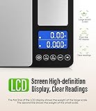 High-Precision Dual Platforms - Mini scale offers 0.001 oz / 0.01 g accuracy up to 1.1 lb / 500 g for spices, yeast, or coffee grounds; large scale delivers 0.05 oz / 1 g accuracy up to 33 lb / 15 kg for flour, meat, and bulk ingredients - combining delicate precision with heavy-duty capacity. Dual-Line LCD Display - One screen shows both platforms’ weights at the same time and even allows adding them together. Save time with complex recipes, multi-dish cooking, and meal prepping without switching scales. Multiple Units & Tare Function - Easily switch between grams, ounces, pounds, and kilograms for any recipe. The tare function ensures exact measurement of each ingredient, giving you consistent results in baking, cooking, and portion control. Durable Stainless Steel & Glass Surface - Built with a stainless steel weighing platform and glass panel, this food scale is scratch-resistant, stain-resistant, and easy to wipe clean - perfect for everyday use in a busy kitchen. Auto Shut-Off & Battery Saving - Automatically powers off after 5 minutes of inactivity, extending battery life. Reliable, convenient, and always ready for your next cooking or baking session.