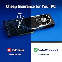 Built for PC building & everyday upgrades (Beginner-friendly): Ideal for first-time PC builds, GPU / RAM / SSD swaps, power supply upgrades, laptop repairs, phone repairs, and classroom projects. A simple way to reduce static risk and protect your entire build at home or at school Cheap insurance for expensive electronics (No experience needed): When you’re handling high-value components, even a small static accident can be costly. This anti static ESD mat kit helps reduce that risk and brings real peace of mind during builds, upgrades, and repairs Static dissipative, not a bare conductor: Designed to slowly release static charge to help reduce ESD risk during real-world PC builds and repairs. Not intended for direct continuity testing with a multimeter or for industrial ESD certification testing Complete starter kit, no extra parts needed (Easy grounding): Includes a 24"×24" anti static mat with adjustable wrist strap, grounding hub, grounding cord, alligator clip, and grounding plug. Quick setup—Wear Connect Plug. Follow the quick-start images and included instructions for the recommended grounding method Foldable and portable for home & on-the-go work: Folds into a backpack or tool bag for home repairs, classes, and mobile projects. Light creases and a mild new-mat smell are normal and air out quickly. Not intended as a heavy-duty soldering bench or permanent industrial workstation mat