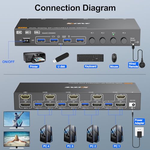 HDMI+Displayport KVM Switch 2 Monitors 4 Computers 8K@60Hz 4K@144Hz, Dual Monitor KVM Switch for 4 PC Share 2 Monitors and 4 USB3.0 Devices, with 4 USB Cables, Power Adapter and Wired Remote