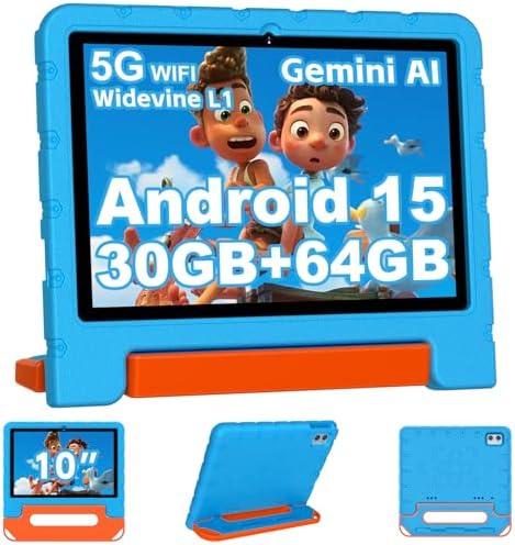 2025 Kids Tablet 10 inch Android 15 Tablets for Kid Octa-Core, 30GB+64GB (TF 1TB), Toddler Tablet with Shockproof Case, 5G WiFi, Parental Control, Widevine L1, Gemini AI, Split Screen, BT5.0-Blue
