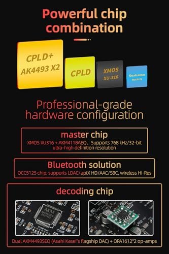 - 👍 Professional-grade hardware configuration ▶️ Master chip: XMOS XU316+AKM4118AEQ, Supports 768 kHz/32-bit, ultra-high definition resolution. Bluetooth solution: QCC5125 chip, supports LDAC/aptX HD/AAC/SBC, wireless Hi-Res. Decoding chip: Dual AKM4493SEQ (Asahi Kasei's flagship DAC)+OPA1612*2 op-amps