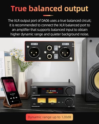 - 👍 True balanced output ▶️ The XLR output port of DA06 uses a true balanced circuit; it is recommended to connect the XLR balanced port to an amplifier that supports balanced input to obtain higher dynamic range and quieter background noise.Dynamic range up to 120dB