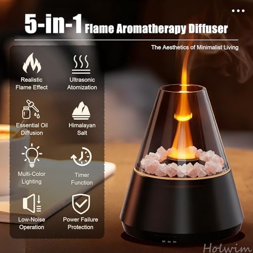 - 【5-IN-1 FUNCTIONAL UNIT with Heated Himalayan Pink Salt Rock】Holwim aroma diffuser combines humidification + aromatherapy + 3D flame effect + 7-color light + heated Pure Himalayan Pink Salt Rock! It comes with unprocessed Himalayan pink salt crystals, which the diffuser heats to unlock natural therapeutic properties, pairing perfectly with the device’s multi-functional design.