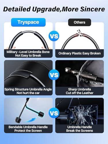 - [Effortless to Use & Store] The TrySpace Sunshade, akin to an umbrella, offers effortless installation and storage. Designed for convenience, it collapses in seconds, fitting seamlessly into our exclusive holster for easy storage in your car's under-seat or door pocket. Its user-friendly design ensures hassle-free sun protection.
