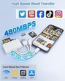 - Ultra-fast Data Transfer: With maximum transfer speed of 480Mbps, the XD card reader can transfer photos and videos from your camera to your iPhone in seconds. It supports standard photo formats, JPEG, RAW and SD/HD video formats, including H.264 and MPEG-4(Support exFAT ,NOT support NTFS). It allows you to quickly transfer large files and photos, saving your precious time. All-round design, fully compatible: The sd card reader has three data cable ports: USB C+Lightning+USB A, supporting connection to iPhone, iPad, computer and Andrsoid devices. It also has three memory card slots: XD card slot/SD card slot/TF card slot, compatible with SD, SDHC, SDXC, MicroSD, MicroSDXC, MicroSDHC and XD memory card Powerful practicality: The sd card reader for iphone supports data transfer of files with a maximum memory of 2TB. It is suitable for memory cards of Pocket 3/Gopro/dash cam/camera/mobile phone/surveillance/drone and other devices. The card reader is not limited to a single memory card type, which is very practical. Two-way transmission: The micro sd card reader supports two-way data transmission. The card reader not only supports the transfer of SD card data to iPhone/iPad, but also can transfer iPhone data to SD card, expanding the device storage space. Plug and Play: No need to connect to the application, no Internet connection, no additional drivers or software, just connect the xd card adapter to the device and the data transfer will be completed in seconds.