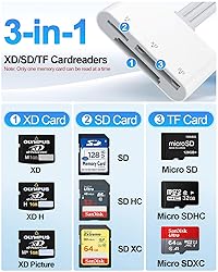 3-in-1 XD Picture Card Reader: Triple-Interface XD/SD card reader Adapter with Lightning/USB-C/USB-A connector to fit iPhone, iPad, Android phones, PCs, MacBooks and Surface and all devices you need. Carry 3 in 1 SD/TF/XD Card Reader Adapter to demand all your need Professional Camera Card Reader for Photographer: This xd card reader for iphone with three dedicated card slots (SD/TF/XD) supporting SD/SDHC/SDXC, MicroSD/MicroSDHC/MicroSDXC, and XD memory cards. 480 Mbps Ultra-fast Data Transfer: This Fujifilm XD Card Reader With maximum transfer speed of 480Mbps, can transfer photos and videos from your camera to your iPhone in seconds. Perfect for HD content creators needing rapid, reliable file management. Lightning to sd card reader supports standard photo formats, JPEG, RAW and SD/HD video formats, including H.264 and MPEG-4(Support exFAT ,NOT support NTFS) Plug and Play: The xd card adapter No need to connect to the application, no Internet connection, no additional drivers or software, just connect the xd picture card reader to the device and the data transfer will be completed in seconds. Two-way transmission: The Lightning to sd card reader supports two-way data transmission. The card reader not only supports the transfer of SD card data to iPhone/iPad, but also can transfer iPhone data to SD card, expanding the device storage space. The sd card reader for iphone supports data transfer of files with a maximum memory of 2TB.iphone sd card reader suitable for memory cards of Pocket 3/Gopro/dash cam/camera/mobile phone/surveillance/drone and other devices Universal Compatibility: This sd card reader for iPhone 17-8 series, iPad, Samsung Galaxy, Google Pixel, MacBook, Surface laptop and PC.Compatible with most systems--Mac OS, iOS, Android, Linux, Chrome OS, Windows XP/Vista/7/8/8.1/10,11,etc. Any problem just contact us without hesitation, we will provide a solution that meets your satisfaction. Important Notes: 1) Ensure the memory card is formatted to a supported file system (e.g., exFAT). NTFS is not supported; 2) Due to system limitations, the card reader can read only one card at a time. Do not insert two cards simultaneously; 3) For Android devices, insert the memory card into the card reader first, then connect the card reader to the device. When changing memory cards, unplug the card reader and reconnect it after inserting the new card to avoid recognition issues.