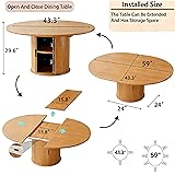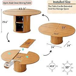 - "Extendable Dining Table: Black clips underneath the tabletop easily transform your round dining table from a 43.3-inch round shape to a spacious 59-inch oval, accommodating up to eight diners. The removable top neatly stores in the center space, minimizing footprint and making it ideal for smaller spaces. It's perfect for cozy apartments or families seeking flexible dining solutions. Dining Table for Families of 4-6-8: This extendable round dining table comfortably accommodates 4 to 6 people, making it ideal for family dinners, holiday feasts, and casual gatherings. It expands from a small table to a large table to accommodate your dining needs. Round Storage Dining Table: This round dining table features two tiers of storage, with a clever base featuring sliding doors that reveal spacious double-layer cabinetry. Organize cutlery, condiments, or kitchen essentials while keeping the beautiful wooden surface pristine. This versatile table meets everyday needs and is ideal for kitchens, dining rooms, and modern apartments. Thick Material: The rounded edges of the table protect your family from bumps and bumps, ensuring their safety. The wood paneling on this dining table is long-lasting and easy to maintain! This oval dining table is crafted from high-quality, high-density medium-density fiberboard (MDF) with a realistic wood grain finish that's scratch- and stain-resistant. Simply wipe with a damp cloth. This modern table is supported by a sturdy, thick base, providing stability and durability for everyday use. "