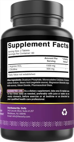 Oxify L-Arginine L-Citrulline Complex delivers a 2000 mg blend of two amino acids in each serving. This formula includes 120 tablets and is made without gluten or genetically modified ingredients. Manufactured in the USA, it’s designed for individuals seeking to include amino acid supplements as part of their daily routine.