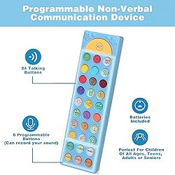 24 Easy To Understand Talking Buttons- Our device for speech comes with 24 pre-installed instructions in a picture and color format that makes it very easy to communicate simple, but essential instructions such as yes, no, I’m thirsty, I’m sleepy, it's too loud and many more, Compared with other competing products, more talking buttons can better meet daily needs 6 Programmable Buttons- device for autism feature 6 programmable buttons that allow you to record your own tailored instructions with your voice! You can customize the device to your specific needs by recording your voice, to provide a more personalized and effective communication experienced Adjustable Volume- Communication Device for Speech Therapy Requires 3AAA batteries, the sound is louder and louder, you can use it in busy areas at will. device can also adjust the volume to meet the needs of any scenario. The product is lightweight and has a storage bag, so it is easy to carry when traveling A Wide Variety Of Uses- The non verbal communication tools are suitable for a wide range of individuals, including non-verbal Children, those with autism or other special needs, as aids for stroke patients, those with apraxia or aphasia, or just anyone with speech difficulties. The device is a fantastic convenient alternative to non verbal communication cards, PEC cards for autism, and communication boards for nonverbal kids Reduce Anxiety and Build Confidence-Build confidence and understanding by Clicking the button to expand language and communication skills and encourage response and recognition with pictorial cues. Engineered to help provide nonverbal individuals with an effective means of communication to express their needs and feelings with loved ones
