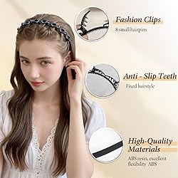 【Product Features and Material Advantages】 Includes four hollow braided headbands (two black and two brown), each with a clip. Made of ABS resin, this headband is highly flexible and maintains its shape over time. It's lightweight, comfortable, and effectively secures your hair 【Thoughtful Design Details】Each headband features a raised tooth design with eight clips, allowing you to choose the number of clips you need for custom shaping. The double-layer clip design allows you to braid your bangs on the top and secure your hair on the bottom, making it easy to create stunning hairstyles 【Suitable for a variety of hair types】Suitable for long, medium, and short hair, as well as curly or straight hair types. Easy to use, the clips' flexible shaping allows you to easily create beautiful hairstyles 【Widely Applicable】This headband is an ideal everyday accessory for sports, yoga, going out, applying makeup, washing your face, backpacking, and more. It also makes a great gift for family, friends, or loved ones during holidays like Christmas, Valentine's Day, Teacher's Day, Mother's Day, and New Year's Day 【Comfortable Wearing Experience】The headband is designed to fit snugly on your head, providing a secure and non-compressive fit. It helps massage your scalp, relieving fatigue and stress. The toothed comb also detangles your hair, keeping it neat and tidy