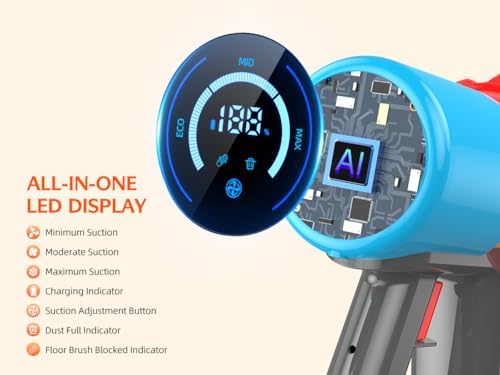 - 【Intelligent Touchscreen for Effortless Control】 Take command with the wireless vacuum cleaner’s responsive, user-friendly touchscreen. Easily switch between three suction levels with a simple tap, and monitor key metrics like battery life, dust cup capacity, and fault alerts in real time. No need to hold a "trigger" constantly—this sleek, high-definition display combines modern design with intuitive functionality, making cleaning smarter and more stylish.