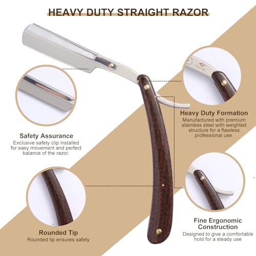 - 🪒【Perfect Beard Cutting】:Our straight edge razor is composed of premium stainless steel,brass with a chrome finish offering a reliable and silken shave every time. This single-blade razor for men is perfectly ergonomically designed and The straight razor features a flip-able blade cover with a comfortable metal grip. Start with gentle strokes and slowly work your way around to keep a steady motion and pressure. And This razors for men is very beautiful and can be reused