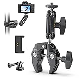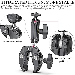 Tired of wobbly mounts and complicated setups? New & Upgraded for Maximum Stability! Our multi-functional camera clamp combines a sleek, all-in-one design with serious holding power. and clamp features embedded non-slip silicone pads in the jaws to prevent sliding, and a and a textured locking knob on the ball head for a tighter, more secure hold that won’t come loose. The Ultimate On-the-Go Shooting Companion. Seamlessly Reposition, Effortlessly Switch: Move your camera or phone between multiple rods and poles in seconds—no tools or screwdrivers needed. Equipped with dual 360° swivel ball heads, this clamp offers limitless angle adjustments for precise framing. It comes standard with both universal 1/4-inch screw and 3/8-inch threads, making it instantly compatible with a vast ecosystem of gear—from cameras and microphones to monitors and LED lights. Build your ultimate shooting setup in seconds. Shoot with Anything: Its versatile design offers extensive compatibility, easily accommodating your smartphone, GoPro, DJI, all action cameras, mirrorless camera, mevo start, monitor, LED video light, microphone, speedlite or other photography gear. CNC Aluminum Materials & Max loads is 4.4 lb: Experience shake-free filming. The enhanced clamping mechanism provides a secure hold on various pole rod(the maximum open distance of the super clamp is 2.36inch(60mm),), so you can capture smooth, professional-quality content every time. What You Get: Super Clamp with with Magic Arm Double Ballhead*1, Gopro Adapter*1, Phone Clamp*1.