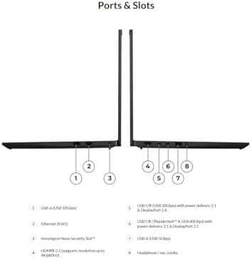 • Ports include: 1x USB-A (USB 5Gbps / USB 3.2 Gen 1); 1x USB-A (USB 10Gbps / USB 3.2 Gen 2), Always On; 1x USB-C (Thunderbolt 4 / USB4 40Gbps), with USB PD 3.1 and DisplayPort 2.1; 1x HDMI 2.1, up to 4K/60Hz; 1x Headphone / microphone combo jack (3.5mm); and 1x Ethernet (RJ-45).